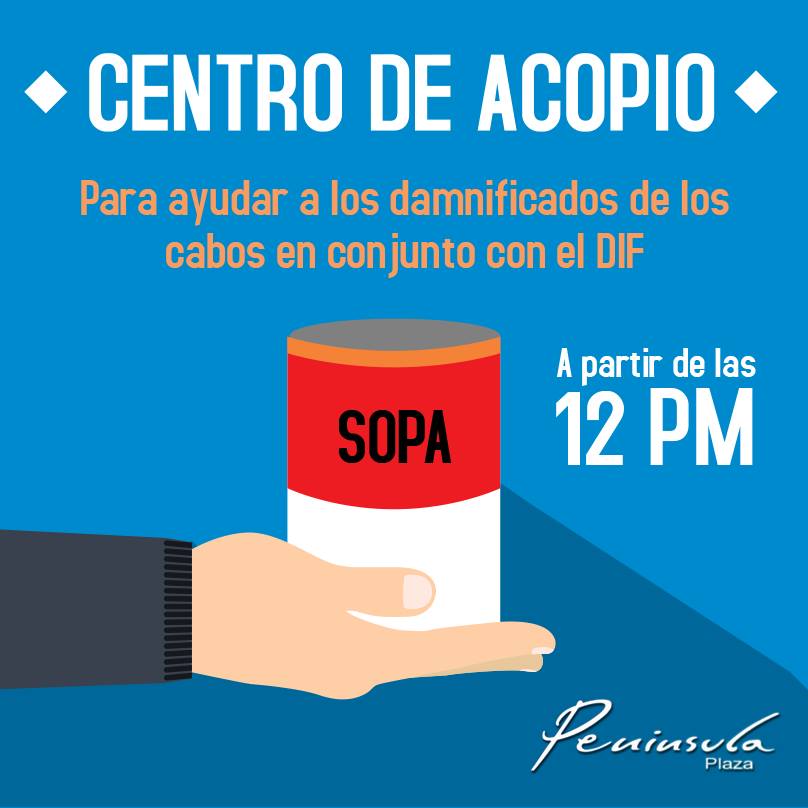 Les informamos que Plaza Península abrió un centro de acopio para ayudar a los damnificados por el huracán Odile en Baja California Sur.