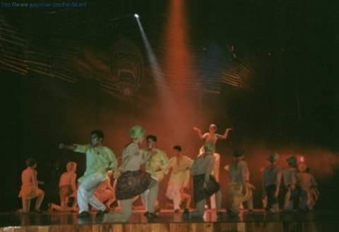 2.- Lidereando a los bomberos que protegen a Vero, la Reina Africana en el Ensamble Musical “Afrika”. Yo era el líder de una tribu salvaje y terminaba matando al protagonista de la obra Carlos Quezada.