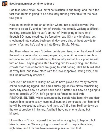 I know this isn’t much against the fear of what’s going to happen, but friends, hear me. We are going to make Donald Trump’s life a living nightmare, and I for one take immense pleasure from that.