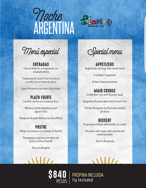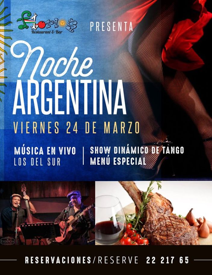 En la tarde/noche de este viernes 24 de marzo, el restaurante italiano-argentino Florios, muy famoso por su sabor, ofrecerá una víspera argentina con un selecto menú argentino. Mientras comes, puedes disfrutar de la música en vivo del grupo “Los del Sur” (Tango, rock and folklore) dirigido por Gustavo Fernández. Voy a bailar tango argentino (Tango de salón, no coreografiado) con una amiga Maricarmen Alvarado. Todos ustedes están invitados a venir y disfrutar de una noche argentina con una gran cena. Chequen las imágenes abajo para más detalles.