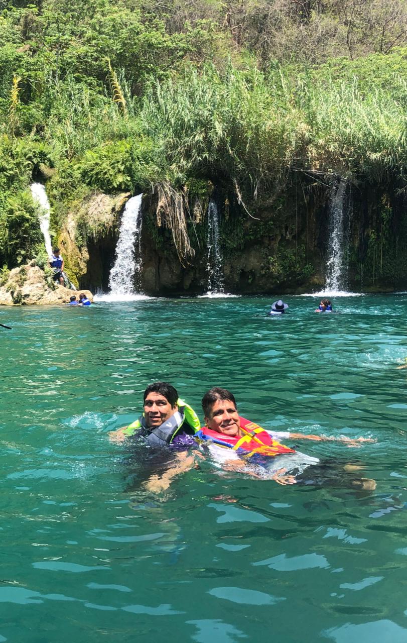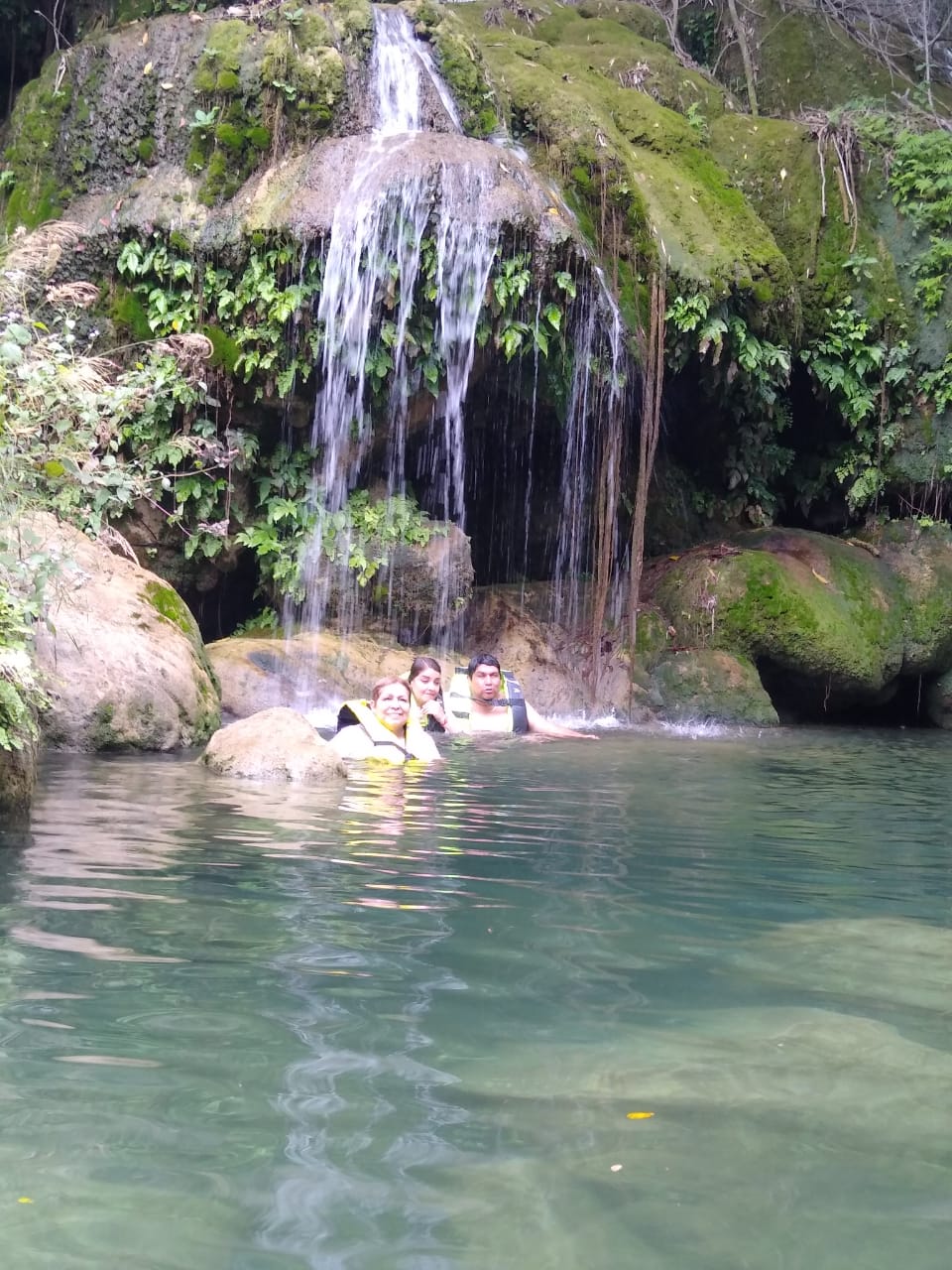 Uno de los lugares más chéveres de nuestro viaje, como decidimos todos al regreso, fue la aventura en la cascada de Tamul. Esta cascada nace cuando el agua del río Gallinas cae al río Santa María, creando así otro río llamado Tampaón. Para llegar ahí, nos dirigimos al poblado de Tanchanchín en el municipio de Aquismón. Allí contratamos el servicio de una lancha de remos con guía para llegar hasta la cascada. Además de la vista espectacular, fue un gran ejercicio. Otra cosa divertida que ocurría es que al pasar otro barco cerca de nosotros, los pasajeros todos comenzamos una guerra de agua. (Consejo de expertos, lleven una cubeta o una pistola de agua para ser más efectivos) ¡Es tan refrescante! En el camino de regreso, pudimos nadar río abajo en los rápidos y disfrutar de otras pequeñas cascadas refrescantes en el camino.