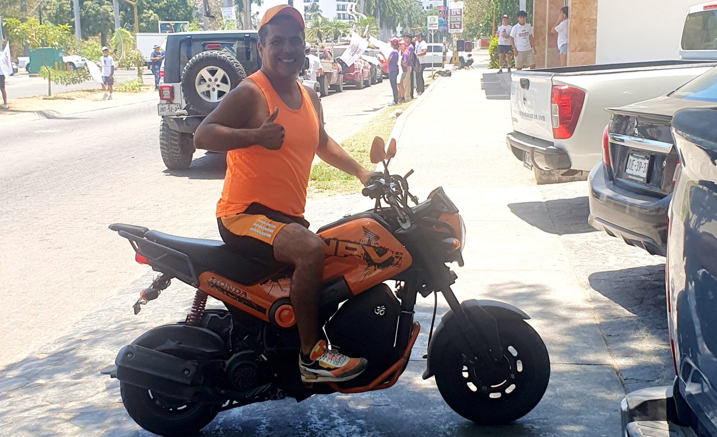 Rien de mes amis de la ville se sont montrés intéressés à y aller, alors je me suis préparé à partir seul sur ma Motomami. Mais évidemment, je devais arriver avant pour prendre mon café chez Elforoteo. J’avais prévu de profiter de la plage de Bucerias, donc mes vêtements était orange de plage. De plus, mes vêtements seraient assortis à la couleur de la moto. Quand j’avais arrivé à Elforoteo, il y avait un groupe de jeunes qui faisaient de la propagande politique en faveur du Claudia Delgadillo. Ce qui est intéressant, c’est que lorsque j’étais habillé tout en orange, j’avais l’air d’être membre du parti Mouvement Citoyen (MC par son acronyme en espagnol). Juste pour m’amuser, j’ai demandé aux gens d’Elforoteo de prendre une photo sournoise de moi habillé en orange et de tous les jeunes en violet derrière. Mais les jeunes s’en sont rendu compte, se sont mis à la plaisanterie et ont rejoint la photo. Ils m’ont dit “On s’en fiche, on est juste des gens payés”. L’image était très drôle. Voila!