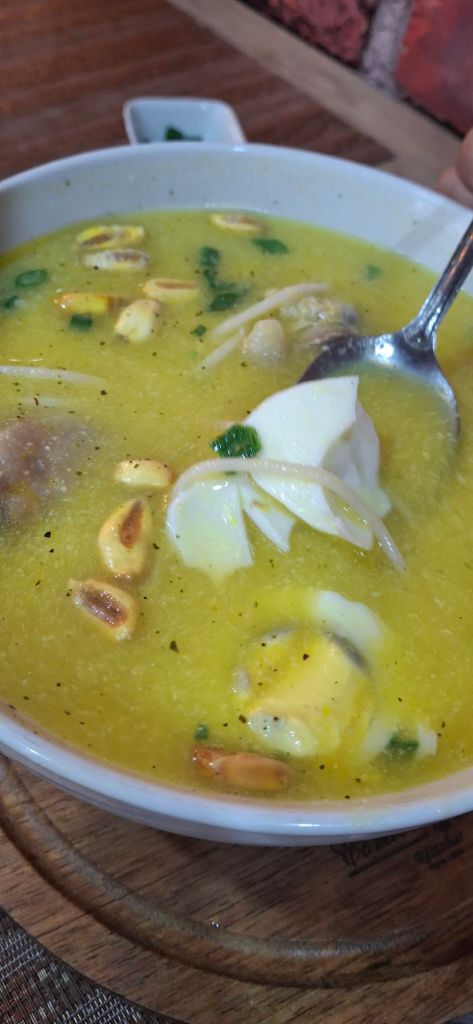 Caldo de Gallina (Caldo con pieza de pollo, huevo cocido, fideos, cebollín y maiz tipo calcha)