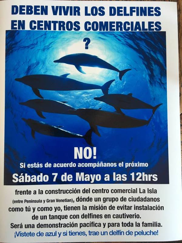 La cita para manifestarse es este 7 de Mayo a las 12pm al lado de la isla en la entrada al estacionamiento de la playa del Holi. Si pueden, vayan vestidos de azul y/o lleven artículos alusivos a los delfines (Peluches, ropa, mantas etc).